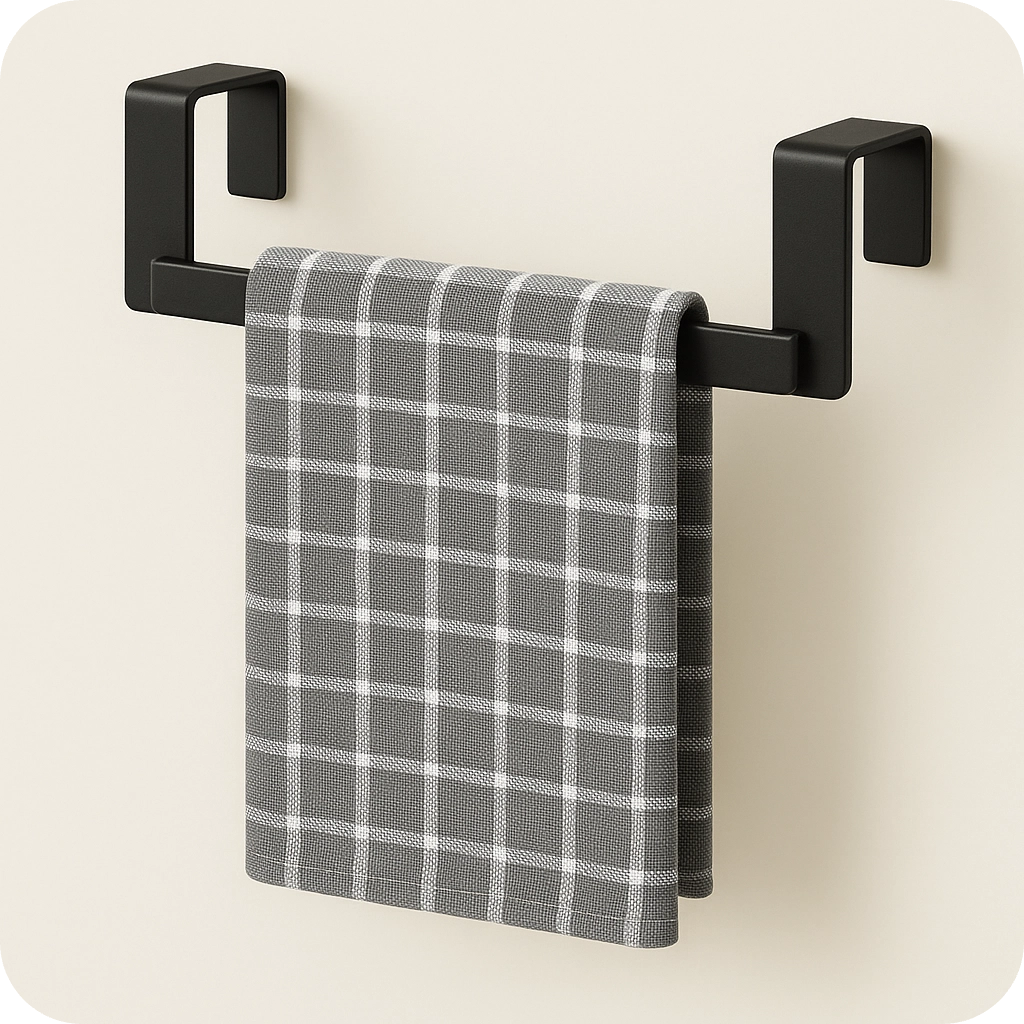 Elegantní a jednoduchý držák na utěrky v moderním černém provedení. Snadno se připevní na dvířka kuchyňské linky nebo skříňky bez nutnosti vrtání. Praktický doplněk, který šetří místo a vypadá skvěle v každé domácnosti.