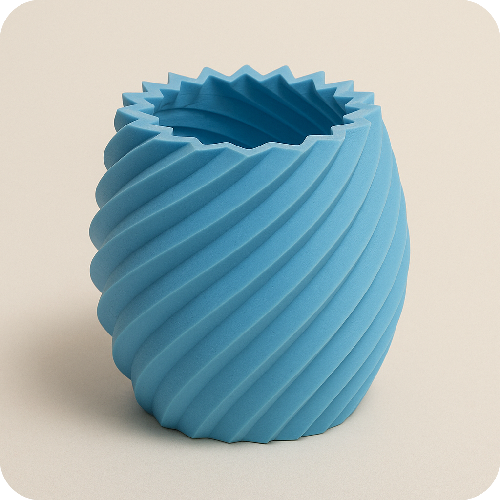 Moderní váza s dynamickým spirálovým tvarem, který evokuje pohyb větru a vody. Její výrazné křivky zaujmou na první pohled a přidají prostoru energii i eleganci. Matný modrý povrch působí jemně a přirozeně, díky čemuž váza ladí s jakýmkoliv interiérem.