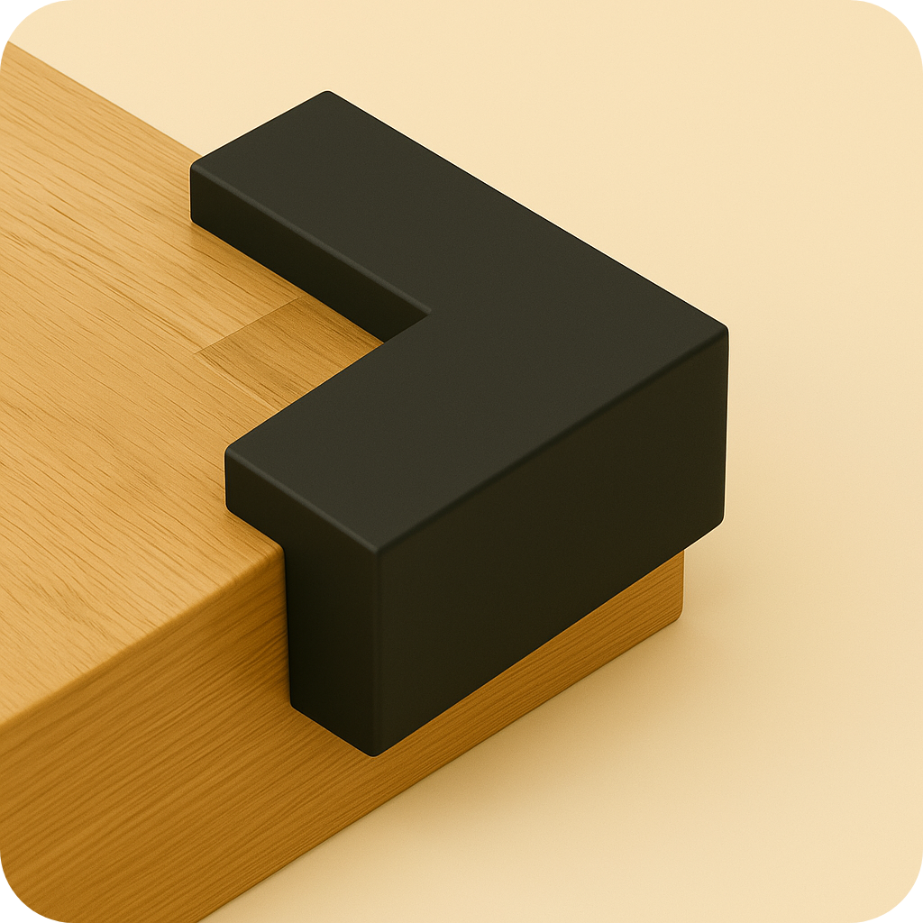 Moderní minimalistická ochrana rohu z pružného TPU. Zakrývá horní část hrany i boky, spodní část stolu zůstává odkrytá – elegantní a praktické řešení pro každý interiér.