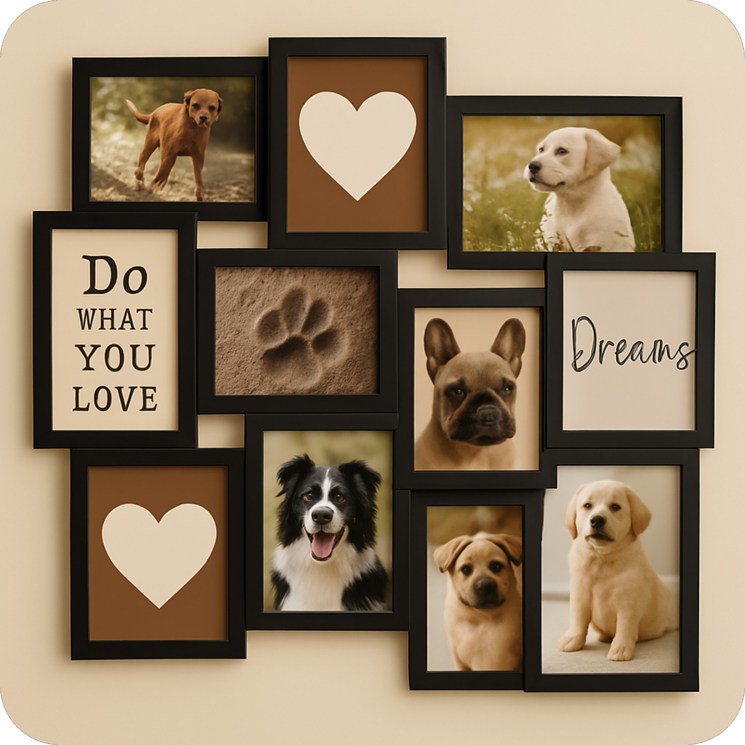 Originální nástěnný fotorámeček vyrobený 3D tiskem, který spojuje eleganci černého rámu s hřejivými motivy pejsků. Ideální pro milovníky zvířat – můžete si do něj vložit vlastní fotografie svých mazlíčků, oblíbené citáty nebo vzpomínky.
